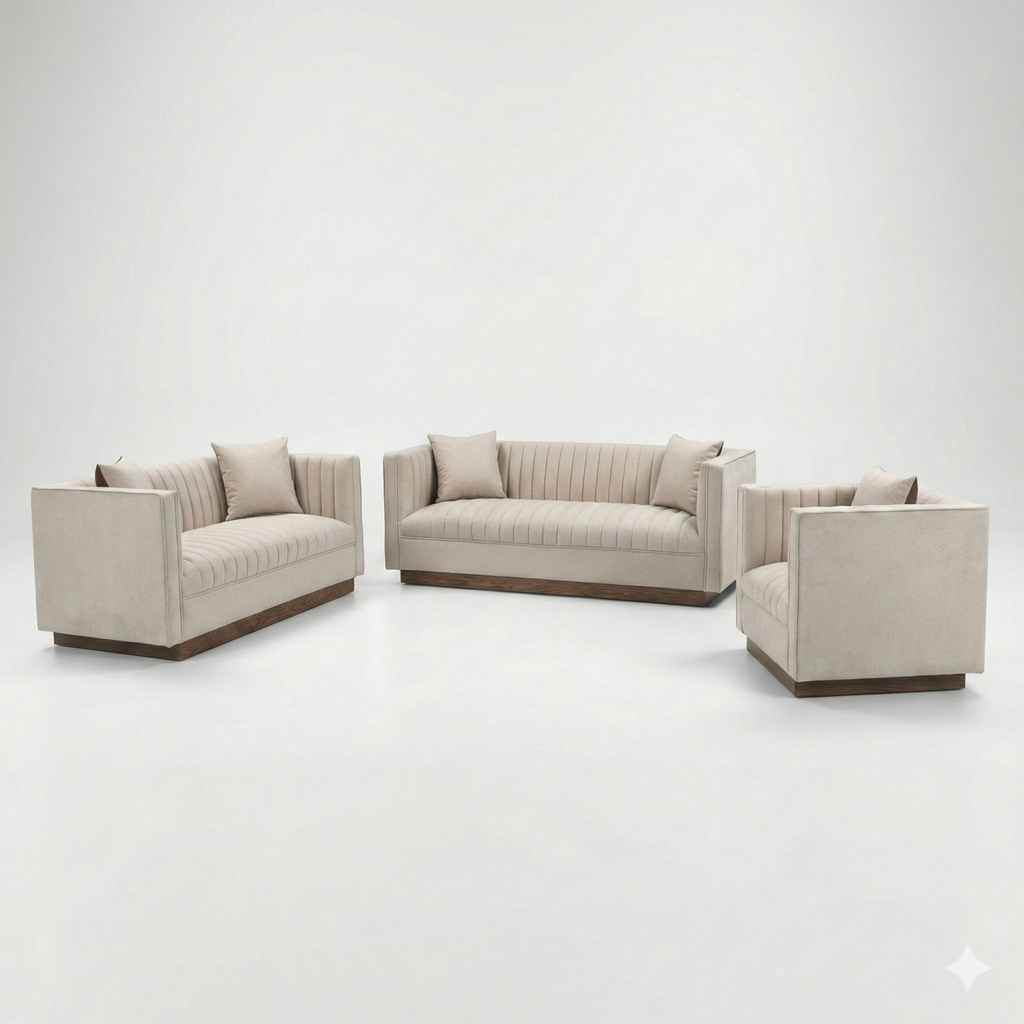 The Cloud Collection – Where Classy Meets Comfy Transform your home into a sanctuary of style with this stunning 3-piece... The Cloud Collection – Where Classy Meets Comfy Transform your home into a sanctuary of style with this stunning 3-piece seating ensemble. Designed to look beautiful from every angle, this set features a sophisticated low-profile silhouette with elegant channel tufting that draws the eye. Don't let the classy looks fool you—this is built for real life. Upholstered in high-end performance fabric, it resists spills and stains while maintaining a soft, luxurious feel. The "cloud design" cushioning ensures that whether you are on the sofa, loveseat, or chair, you are enjoying a deeply comfy experience that feels like floating. Key Features: Durability: High-grade performance fabric stands up to daily use. Design: Vertical channel tufting and a warm wooden plinth base. Comfort: Deep, cloud-like seating for ultimate relaxation. View more