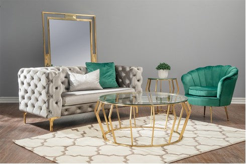 Gold Stainless Steel Base Clear Tempered Glass Top  Remote Coffee Table: 39” Dia x 17.5” H Remote Side Table: 17.5” Dia x 21.5”... Gold Stainless Steel Base Clear Tempered Glass Top  Remote Coffee Table: 39” Dia x 17.5” H Remote Side Table: 17.5” Dia x 21.5” H  *Sold as a set of 3 (1 Coffee Table & 2 Side Tables)  31-124/125  View more