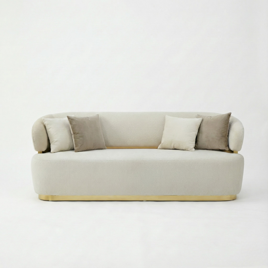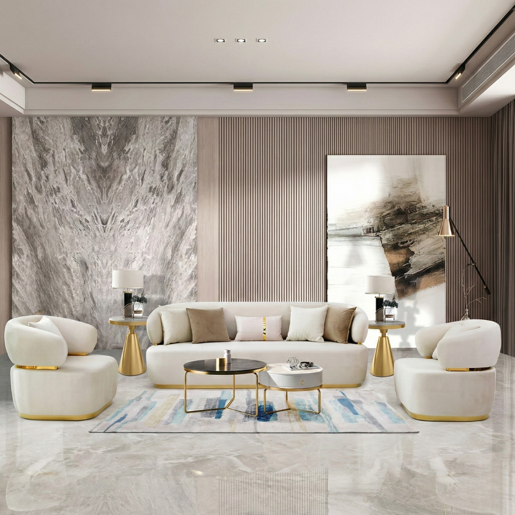 NEW SOFA SET. WHITE FABRIC WITH GOLD TRIM.  CHIAR:        35.5 x 34.5 x 34H LOVE SEAT :... NEW SOFA SET. WHITE FABRIC WITH GOLD TRIM.  CHIAR:        35.5 x 34.5 x 34H LOVE SEAT : 67 x 34.5 x 34H SOFA:          88.5 x 34.5 x 34H View more