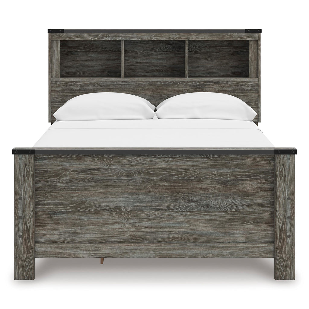 • Includes bookcase headboard, panel footboard, under bed storage with side rail and roll slats