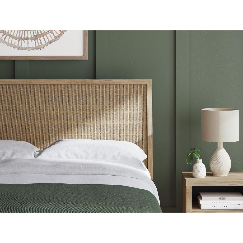 • Headboard panel with textured beige finish that replicates the look of cane