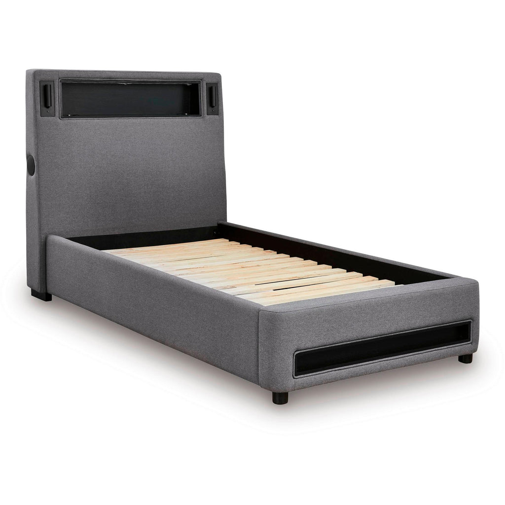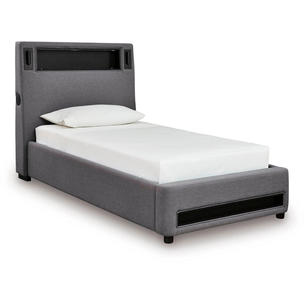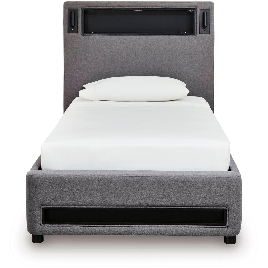 • Includes upholstered headboard, footboard, rails and roll slats