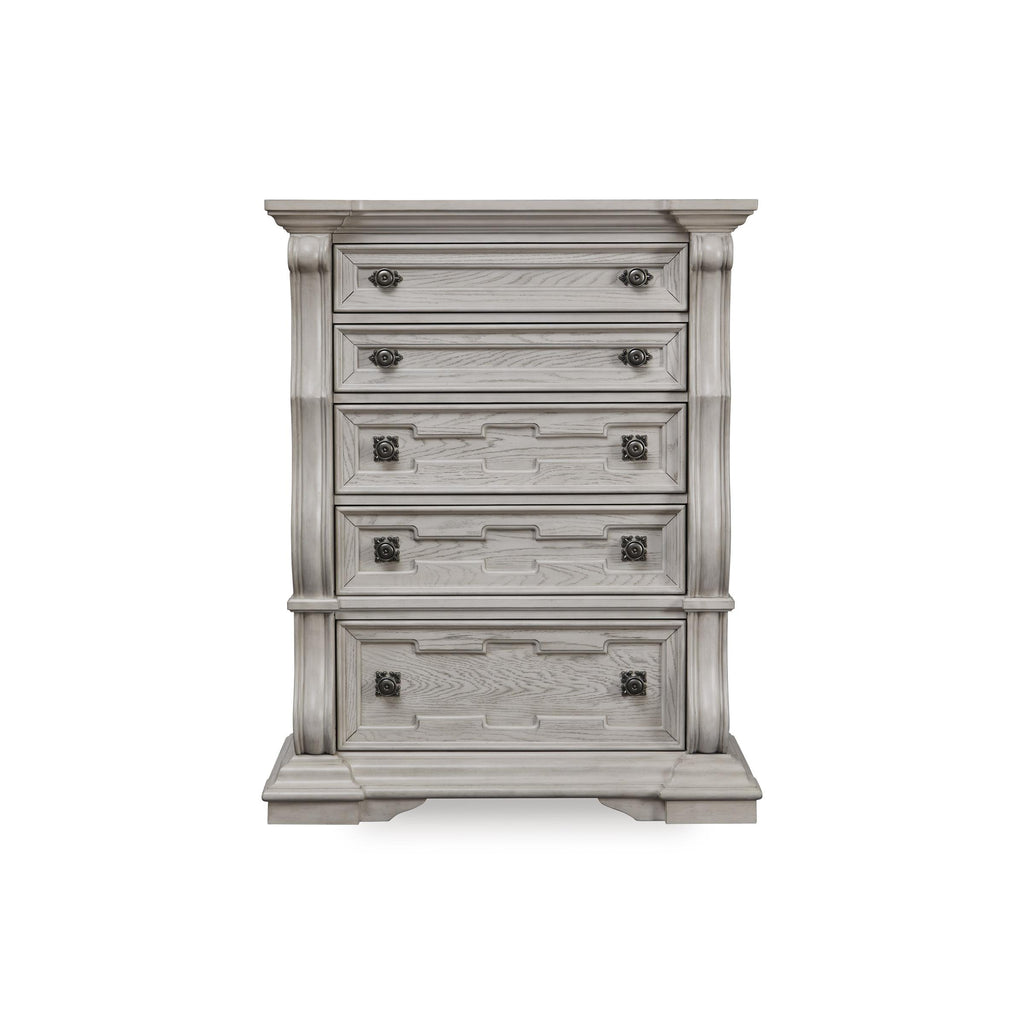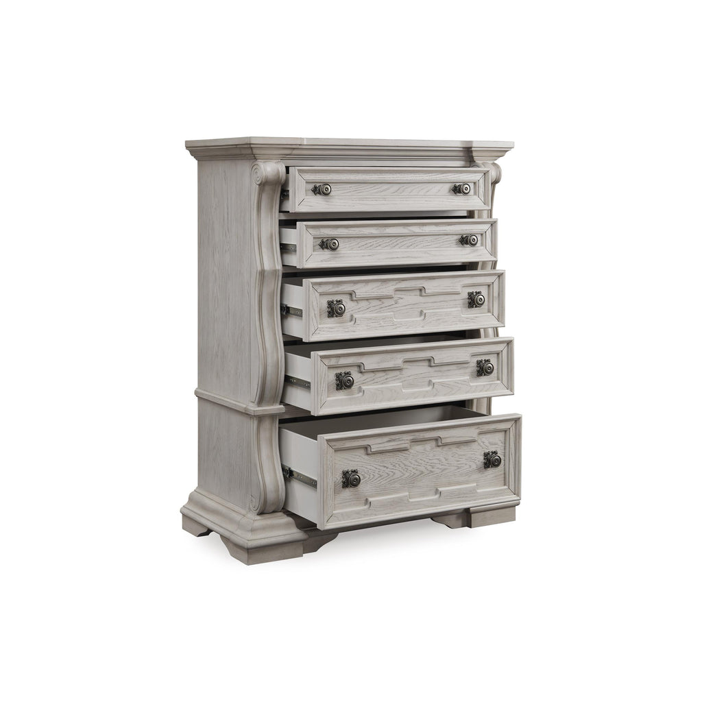 • 5 smooth-gliding drawers with fully finished interiors, English dovetail construction and heavy-duty ball-bearing side glides (top drawer felt lined)