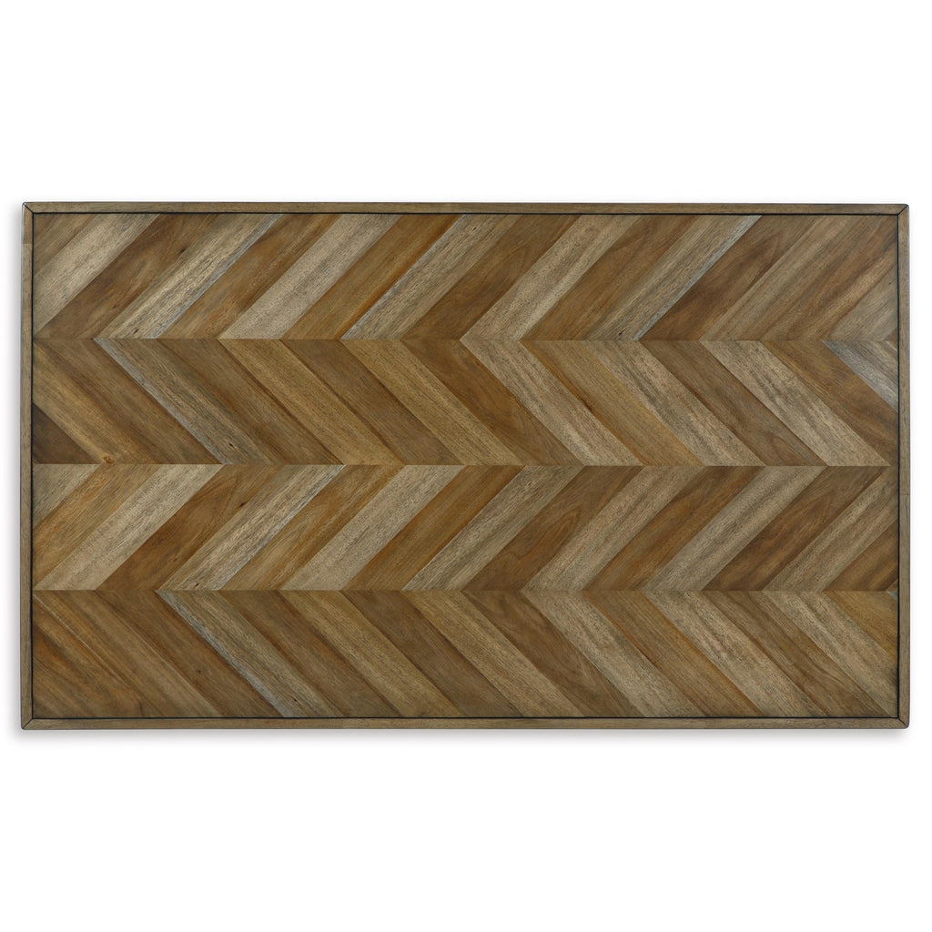 • Inlay tabletop with plank effect in chevron pattern; black tapered legs