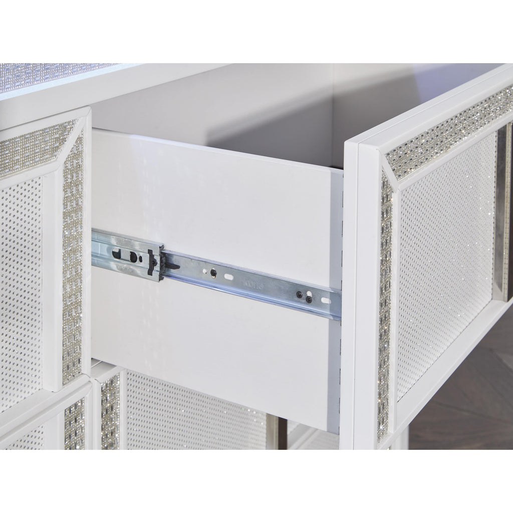 • Drawers with rhinestone frames; textured laminate drawer fronts