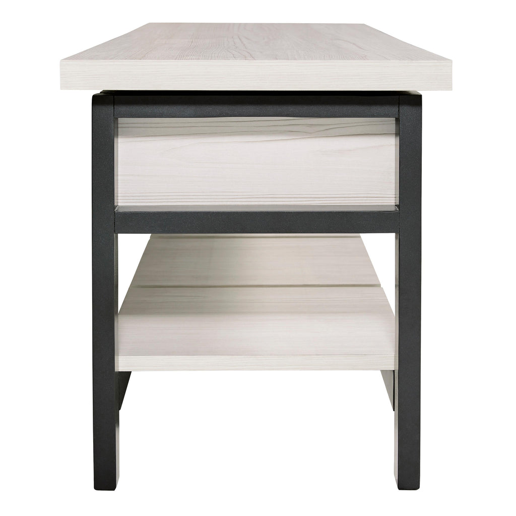 Seating with style and storage—what more could you need? This storage bench has a hinged seat and plank shelf, making... Seating with style and storage—what more could you need? This storage bench has a hinged seat and plank shelf, making it the perfect multi-use piece. The white wood grain effect lends a casual touch, while the black finished legs and supports create a dynamic contrast. View more