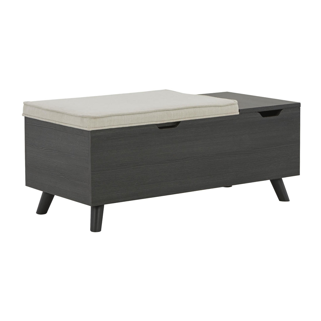 The clean profile of this small storage bench makes an entrance anywhere and everywhere you place it. A replicated blackened... The clean profile of this small storage bench makes an entrance anywhere and everywhere you place it. A replicated blackened wood finish and tapered wood legs lend a fresh flair. Adding form and function, both tops are removable to expose hidden storage underneath. It’s a must-have piece for small spaces. View more