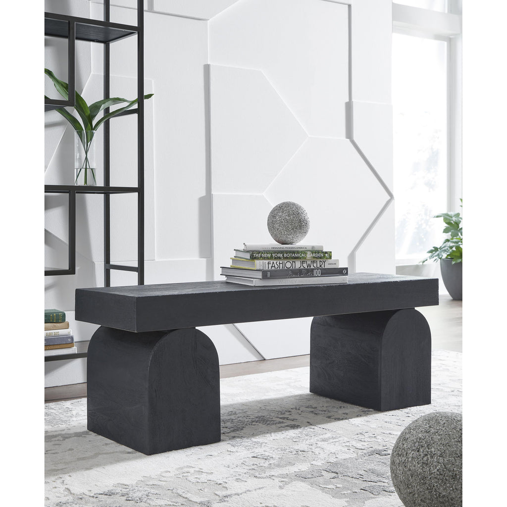 The solid craftsmanship and contemporary style of this bench make it the perfect accent piece in your modern living room,... The solid craftsmanship and contemporary style of this bench make it the perfect accent piece in your modern living room, home office or entryway. Its lightly sandblasted effect exudes a decidedly on-trend vibe. Oversized decorative legs add an upscale art gallery quality. View more