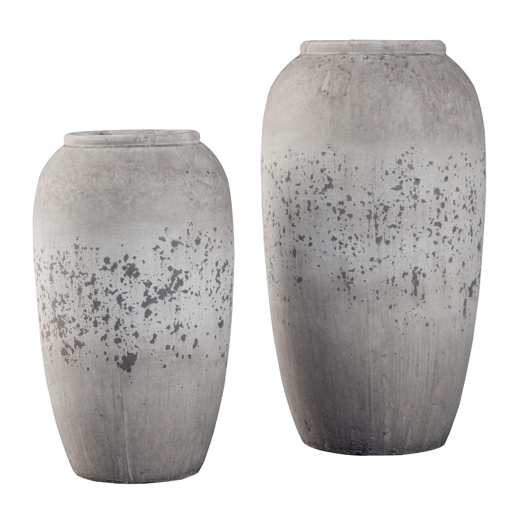 Is your home curated rather than simply decorated? Add another thoughtful piece into the mix with this 2-piece vase set.... Is your home curated rather than simply decorated? Add another thoughtful piece into the mix with this 2-piece vase set. Brown and antique cream painted ceramic has a unique weatherworn finish. Add fresh florals for a vintage-inspired look. View more