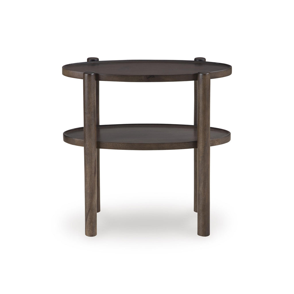 Instantly upgrade any corner with this smart accent table. It's made from solid mango wood in a sophisticated gray-brown finish,... Instantly upgrade any corner with this smart accent table. It's made from solid mango wood in a sophisticated gray-brown finish, with rounded post legs that add a soft feel to a variety of decors. Practical raised edges on both tiers keep essentials securely in place. View more