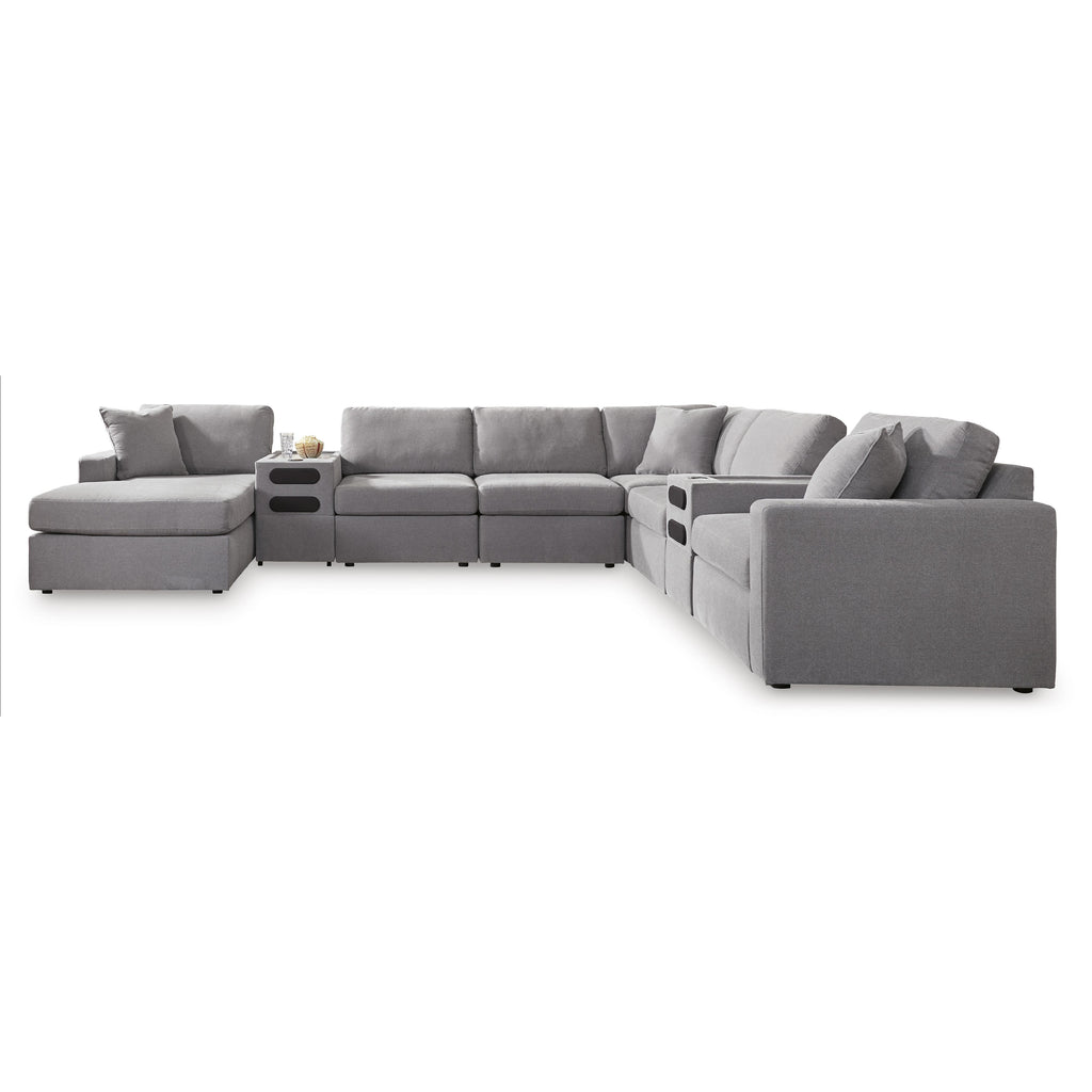 • Includes 8 modular pieces: left-arm facing corner chaise, wedge, 3 armless chairs, 2 audio consoles with storage and right-arm facing corner chair
