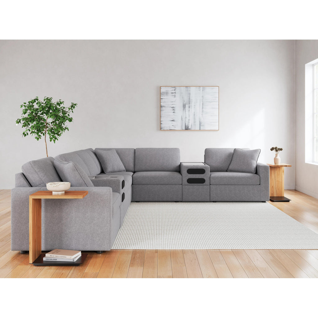 • Includes 8 modular pieces: left-arm facing corner chair, 2 audio consoles with storage, 3 armless chairs, wedge and right-arm facing corner chair